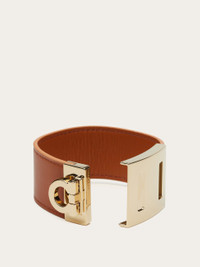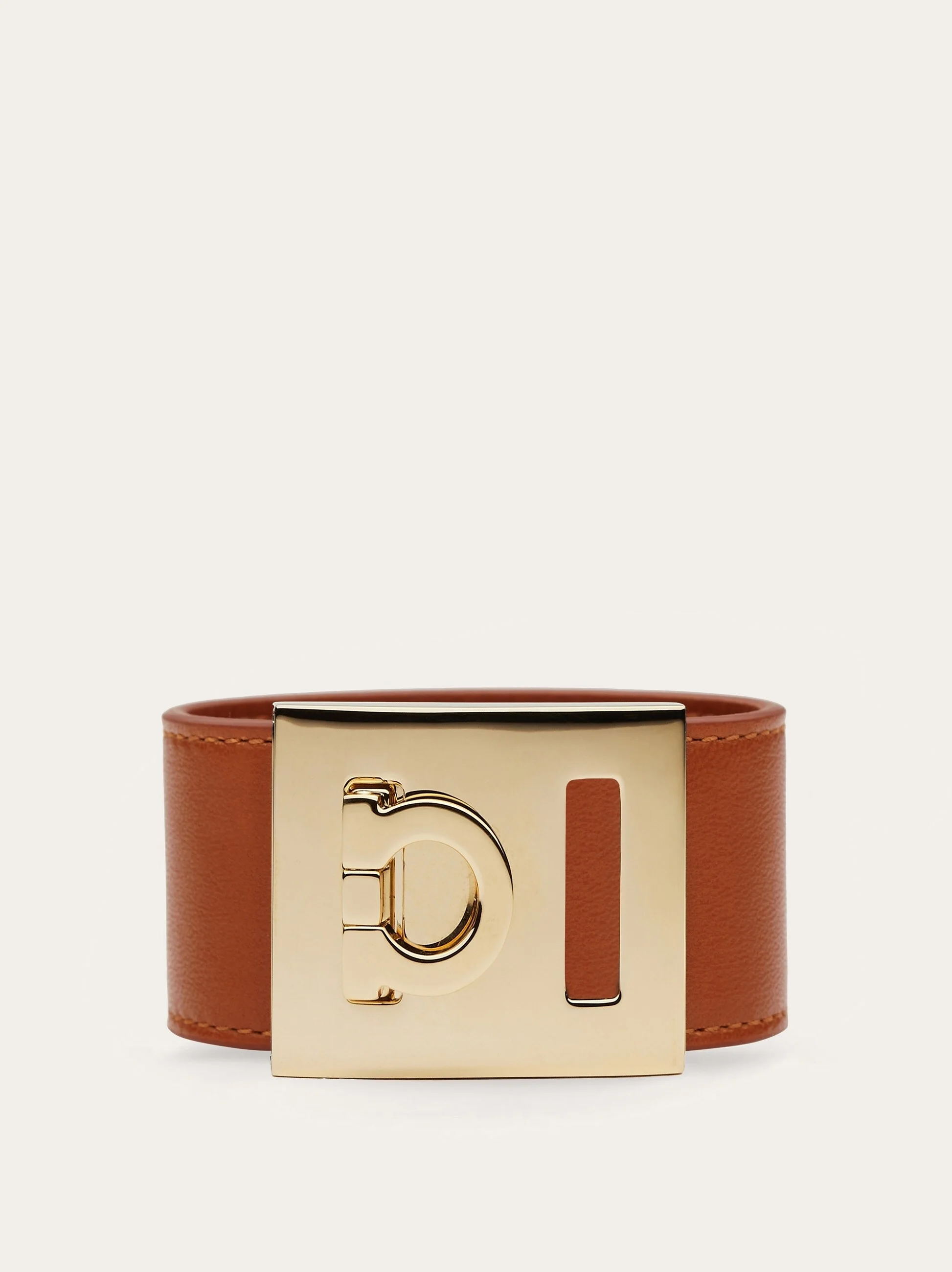 A urban allure and bold look define this new calf leather bracelet with a high profile. The front plate featuring the Gancini conceals the opening buckle, adding a cool touch for everyday wear. - Composition: calfskin and brass - Size 15 - Made in ITALY - Product code: 760767 776161