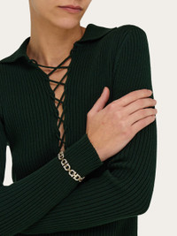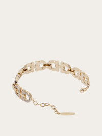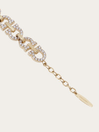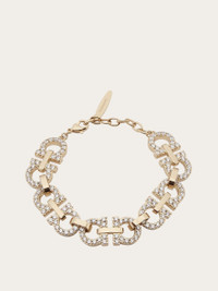 A series of chunky gold-toned, crystal embellished Gancini makes up this chic new Ferragamo bracelet. The clasp is cleverly concealed as one of the chain links. - Composition: brass and crystals - Made in ITALY - Product code: 760898 786537