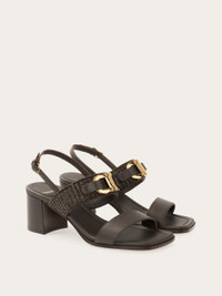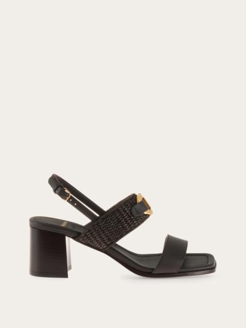 With its two-strap design and softly squared toe, this sandal is at once timeless and of-the-moment. The artful details elevate it beyond the ordinary: the woven raffia insert in a tonal hue and the golden Gancini buckle across the instep. - Composition: raffia and calfskin - Made in ITALY - Product code: 01K501 784354