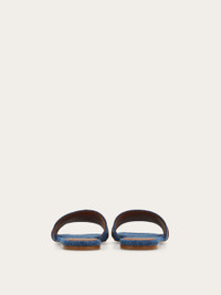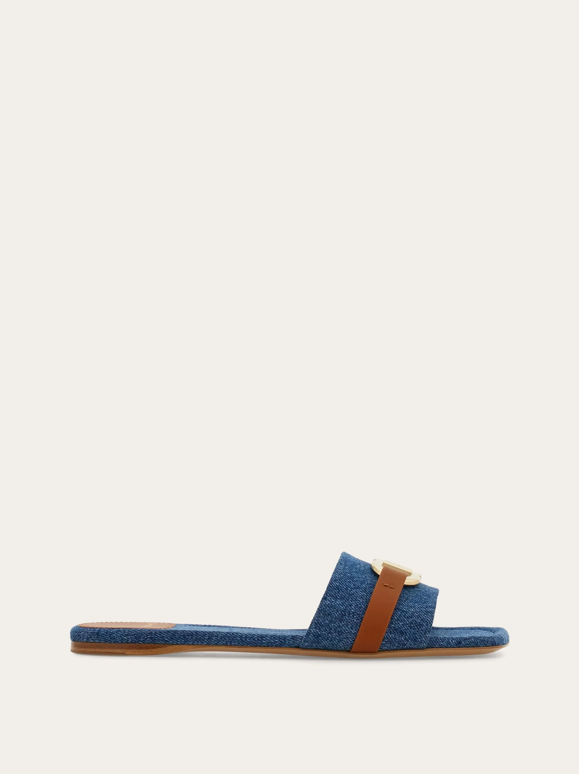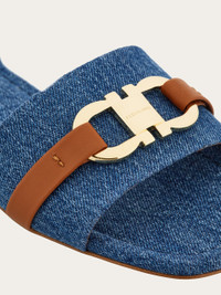 Streamlined yet statement-making: this slide in washed denim oozes laid-back confidence. The wide front strap is enriched with leather details and the golden Gancini motif, lending glamour to everyday looks. It has a squared toe and a lightly cushioned insole for comfort. - Composition: fabric and calfskin - Made in ITALY - Product code: 01K466 784144