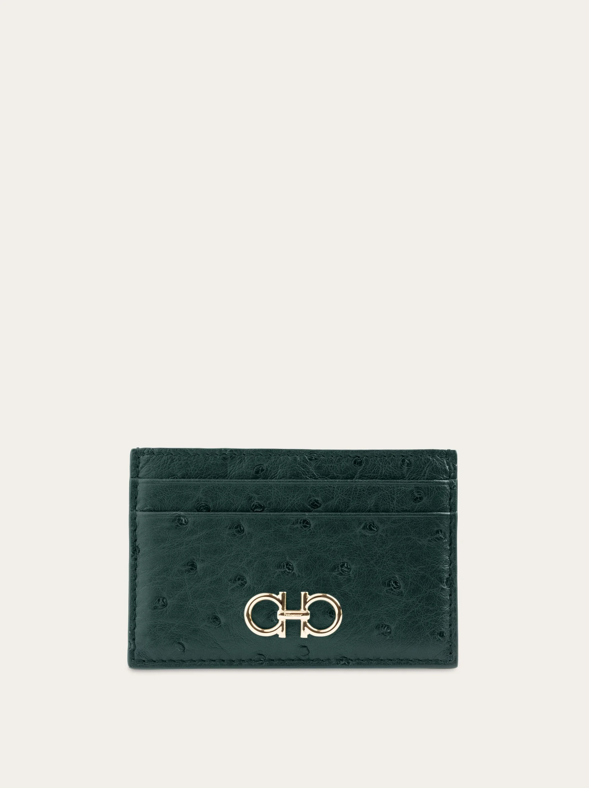 Compact, versatile, easy chic the credit card holder is the perfect ally to keep your essentials close at hand. This chic little space saver is made of hammered calf leather and decorated with an antique gold Gancini on the front for an exclusive finish. - height 2.7 IN length 4.1 IN width 0.1 IN - Composition: ostrich - Made in ITALY - Product code: 220344 787122