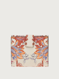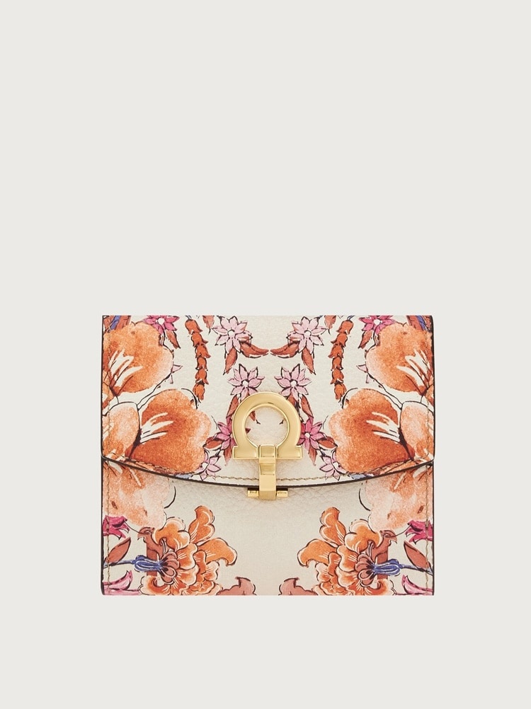 This compact wallet crafted from hammered calfskin exudes feminine allure and boasts a foulard motif-inspired heritage print for a luxe touch. The functional construction features a bill compartment on the interior, flat card slots and a small document holder with see-through window. The outer coin pocket with small button fastens bears the golden Gancini accent. - Composition: hammered calfskin - Made In ITALY