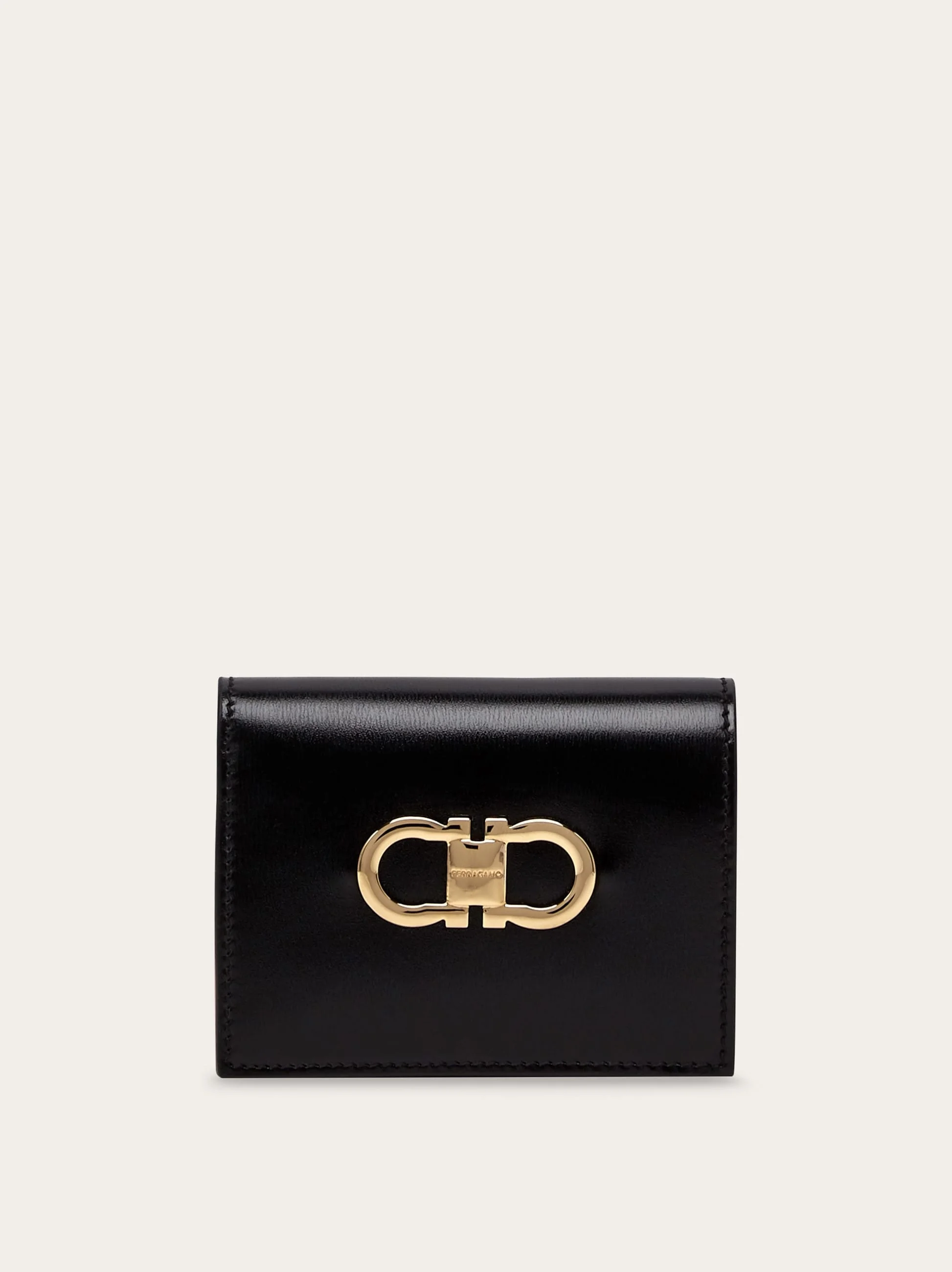 Compact to fit into any handbag, the new Ferragamo wallet reveals a contemporary elegance. Crafted in palmellato calfskin, it features a contrasting interior with pockets and slots for all the essentials. Double golden Gancini on the front, with a squared plaque and engraved signature - height 3.3 IN length 4.3 IN - Composition: palmellato calfskin - 6 card slots, 1 compartment, 1 coin zip pocket - Made in ITALY - Product code: 220627 770769