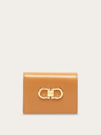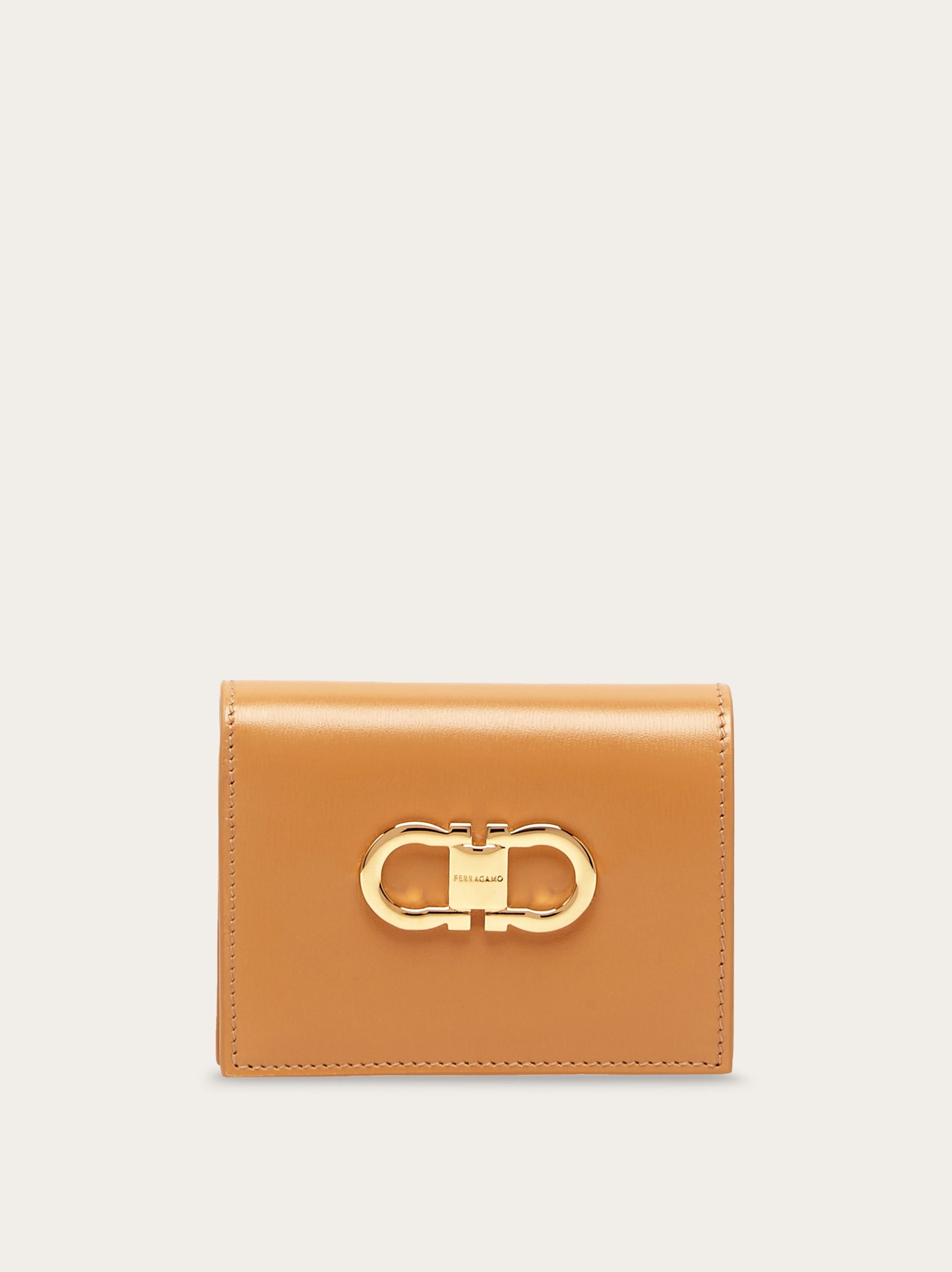 Compact to fit into any handbag, the new Ferragamo wallet reveals a contemporary elegance. Crafted in palmellato calfskin, it features a contrasting interior with pockets and slots for all the essentials. Double golden Gancini on the front, with a squared plaque and engraved signature - height 8.5 CM / 3.3 IN length 11.0 CM / 4.3 IN - Composition: palmellato calfskin - Product code: 220627 770857 - Made in ITALY