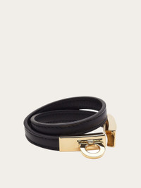 Casual and bold, the new double-wrap bracelet features a smooth calf body and a front plate decorated with Gancini. Perfect for adding a pop of color to everyday outfits. - Composition: calfskin and brass - Size 15 - Made in ITALY - Product code: 760768 776167