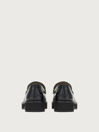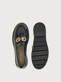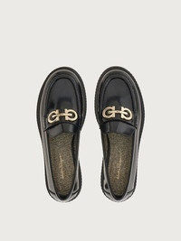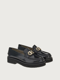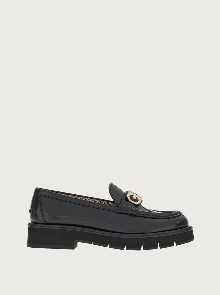 Strong character and contemporary appeal bring new life to a Ferragamo favorite. Made of brushed calf leather, this cool loafer features a slightly rounded toe, raised stitching around the tray, and a double golden Gancio buckle across the instep for an iconic finish. The chunky sole is made of ultra-light rubber, with a protruding welt. The unmissable chevron lining is made of sumptuous goat leather. - Heel 3 cm - Composition: brushed leather - Made In ITALY