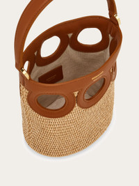 A beautifully woven design and intricate Gancini inlay bring a refined edge to this new mini bucket bag. Celebrating Ferragamo’s heritage in material craftsmanship, it’s a standout accessory for the warmer months, brought to life in vibrant seasonal hues. - height 6.6 IN length 7.0 IN width 4.7 IN - Composition: raffia e calfskin - Handle drop: 5.1 in/13 cm - Extra Small - Made in ITALY - Product code: 220952 783842