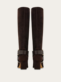 Made of the softest suede with a velvety feel, this pull on knee high boot has a slouch fit on the leg. Available in sophisticated seasonal hues, it is set on a 5.5cm heel and features the iconic Gancio buckle which holds tonal leather straps that wrap the ankle, biker boot style. Leather sole. - Composition: calfskin suede - Made in ITALY - Product code: 01J334 779883