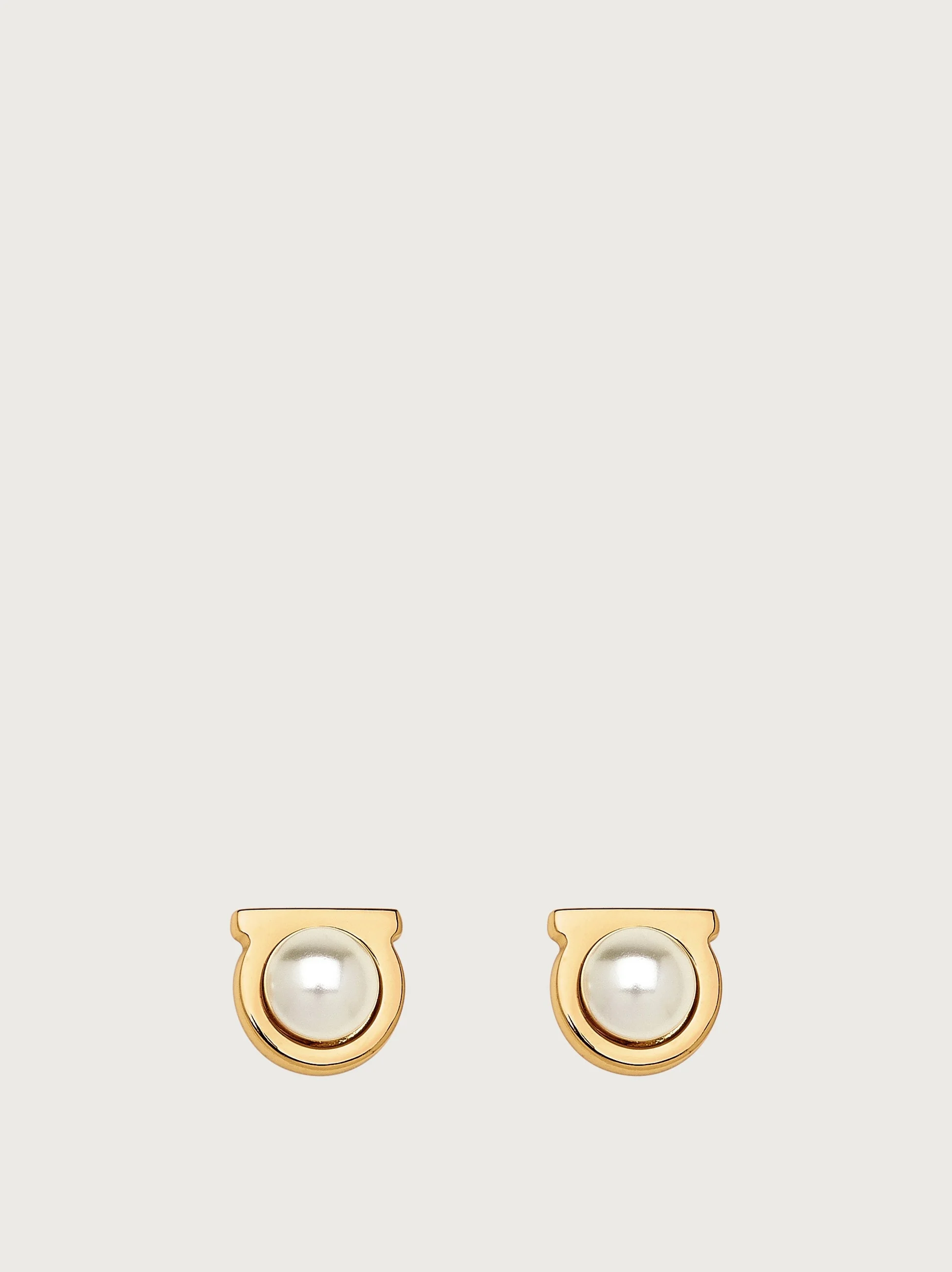 Minimal and contemporary elegance for these earrings with a flat Gancini in a shiny palladium finish and a precious glass pearl. A modern version of a timeless classic. Height 8,5 mm, width 8 mm. - Composition: brass and glass - Made in ITALY - Product code: 760121 696454
