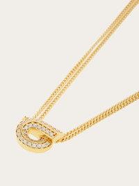 A new elegant necklace with two strands of fine chain and a small golden pendant with pave crystals. The sinuous line of the triangular profile defines the stylized Gancini silhouette to create a fine piece of jewelry that you can wear from day to night. Adjustable clasp for an adjustable length. - Composition: brass - Made in ITALY - Product code: 760706 770481