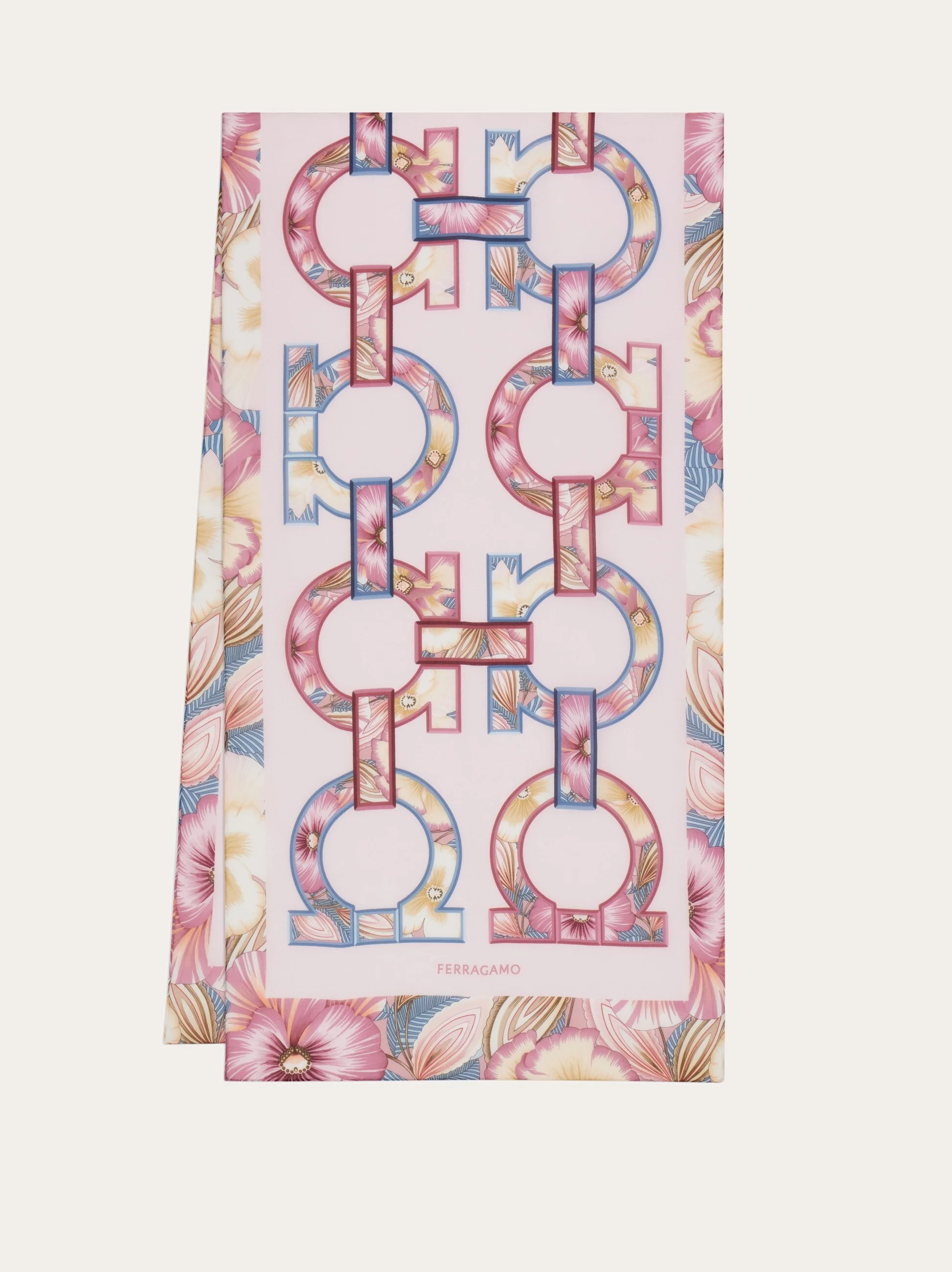 A timeless, universal icon, the Gancini becomes the central motif of this pure silk scarf. Interlinked like the links of an oversized chain, it’s adorned with a print of flowers and fruit inspired by archival designs, blending heritage charm with contemporary flair. - length 62.9 IN width 17.7 IN - Composition: 100% silk - Made in ITALY - Product code: 321254 790103