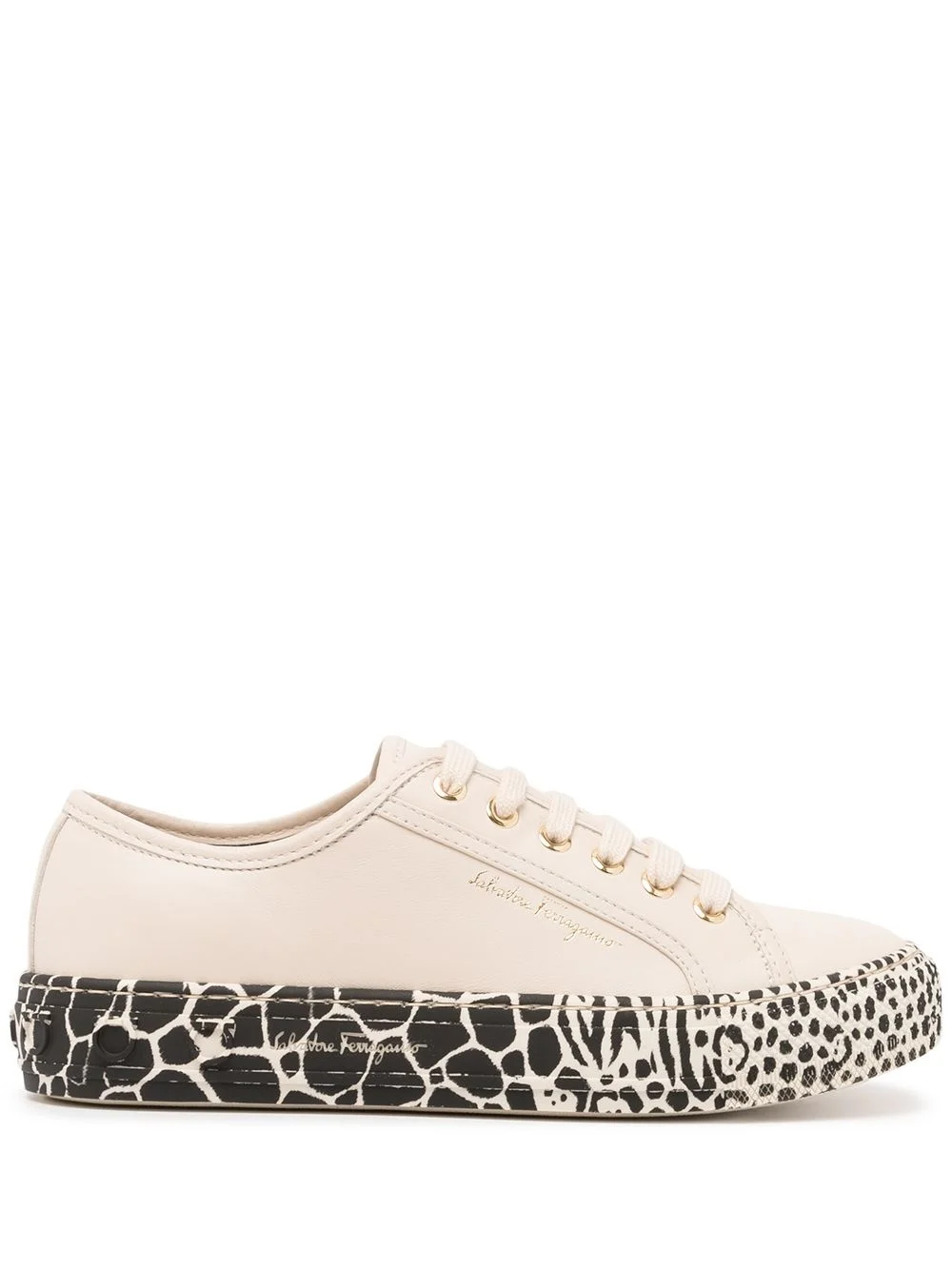 Gancini printed-sole sneakers Salvatore Ferragamo brings some contrast into its SS21 collection. Crafted from calf leather, these low-top sneakers are defined by the animal-print rubber sole that is subtly elevated by the 3D Gancini motifs detailing the side. Made in Italy Composition Outer: Calf Leather 100% Lining: Leather 100% Sole: Other Materials 100% SIZE & FIT Measurement CIRCUMFERENCE 9.84 in(25 cm) HEEL 1.18 in(3 cm) HEIGHT 1.96 in(5 cm) Sole height 1.18 in(3 cm)