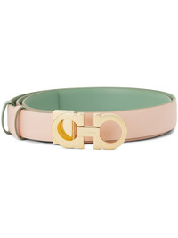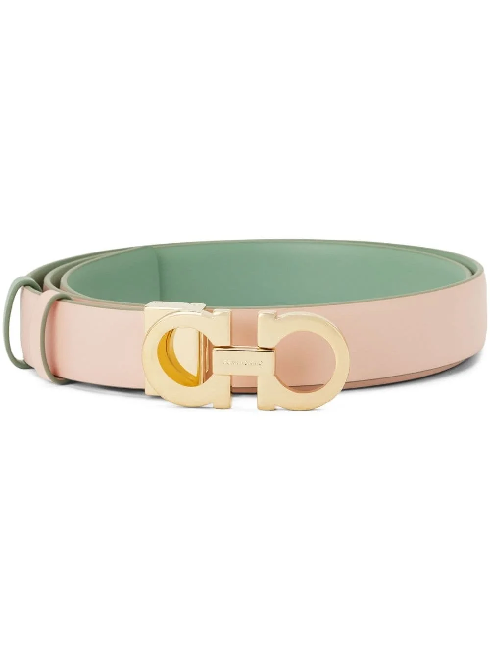 Gancini reversible leather belt Highlights - Light pink, mint green - Calf leather - Reversible - Gancini buckle - Logo-engraved gold-tone hardware - Adjustable fit - Pin fastening Made in Italy Composition Calf Leather 100% SIZE & FIT Measurement Maximum Length 31.88 in(81 cm) Minimum Length 30.31 in(77 cm) WIDTH 1.18 in(3 cm)