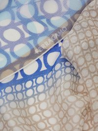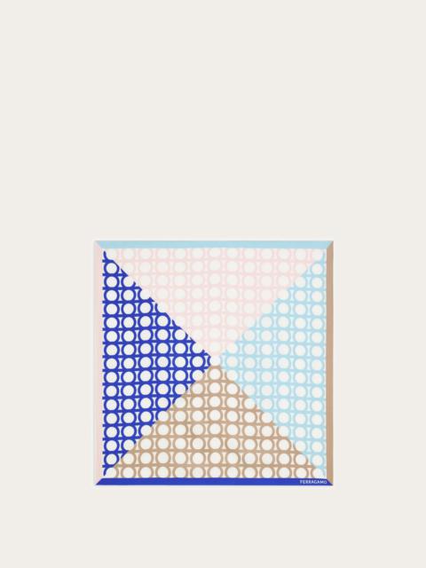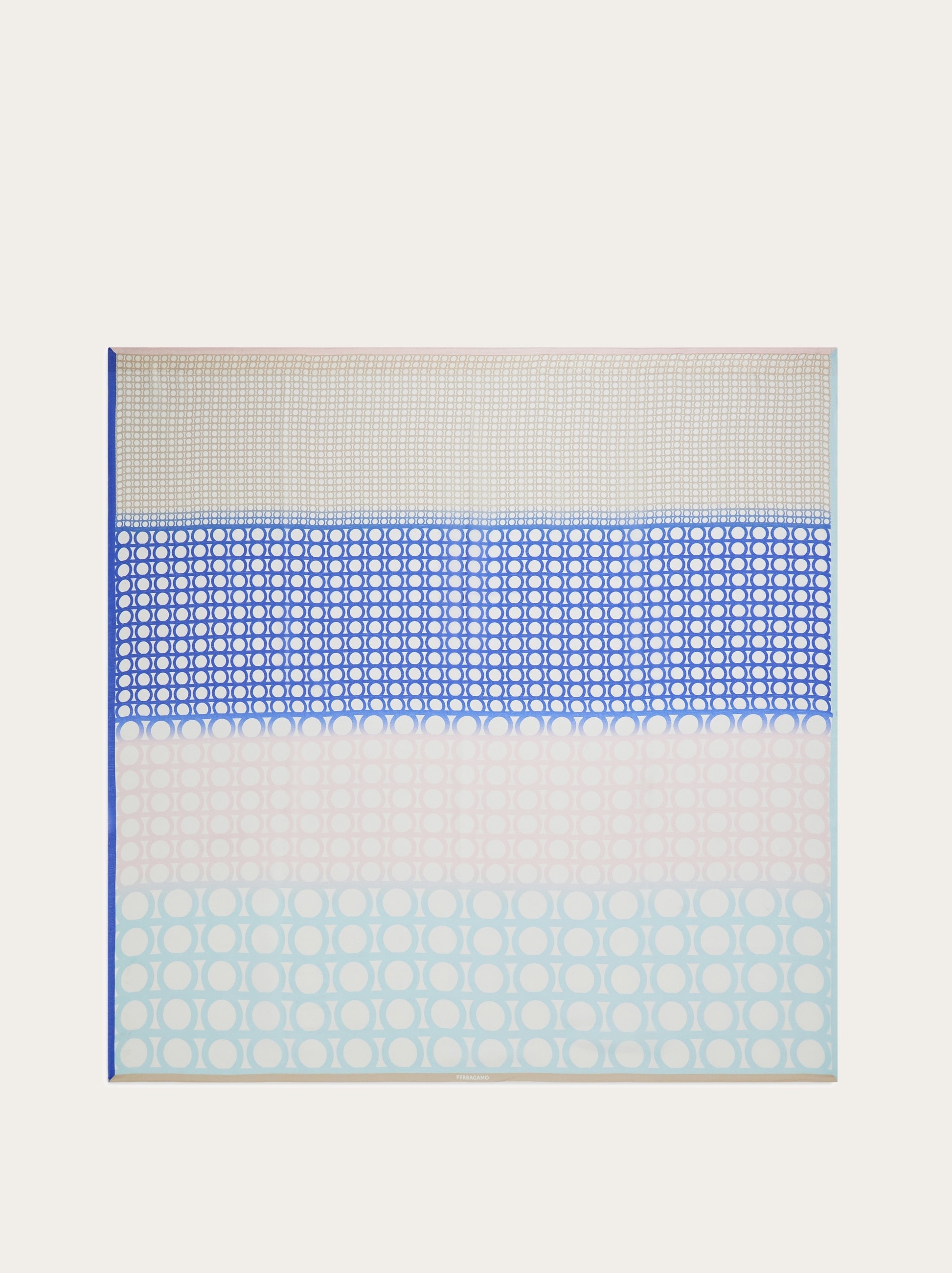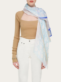 A mix of Gancini-themed patterns adorn this shawl in lightweight pure silk crepe. Matching tones and contrasting textures with a degrade effect create a feminine and contemporary appeal. - length 55.1 IN width 55.1 IN - Composition: 100% silk - Made in ITALY - Product code: 320995 783667