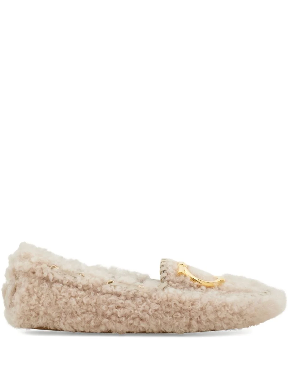 Gancini shearling loafers Highlights - Cream beige - Shearling upper - Leather stitching - Golden gancini plaque - Rubber sole Made in Italy Composition Outer: Sheep Skin/Shearling 100% Lining: Bos Taurus 90%, Goat Skin 10% Sole: Rubber 100%