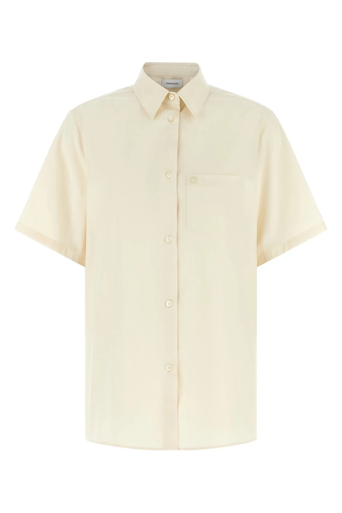 cod. 791702PARCHMENT Cotton and silk blend shirt, breast pocket with tone-on-tone 'Gancini' embroidery, pointed collar, front mother-of-pearl button closure, short sleeves, side splits, and asymmetric hem. Color: Beige Size & Fit: true to size fit Composition: 91% cotton 9% silk Made in: Italy