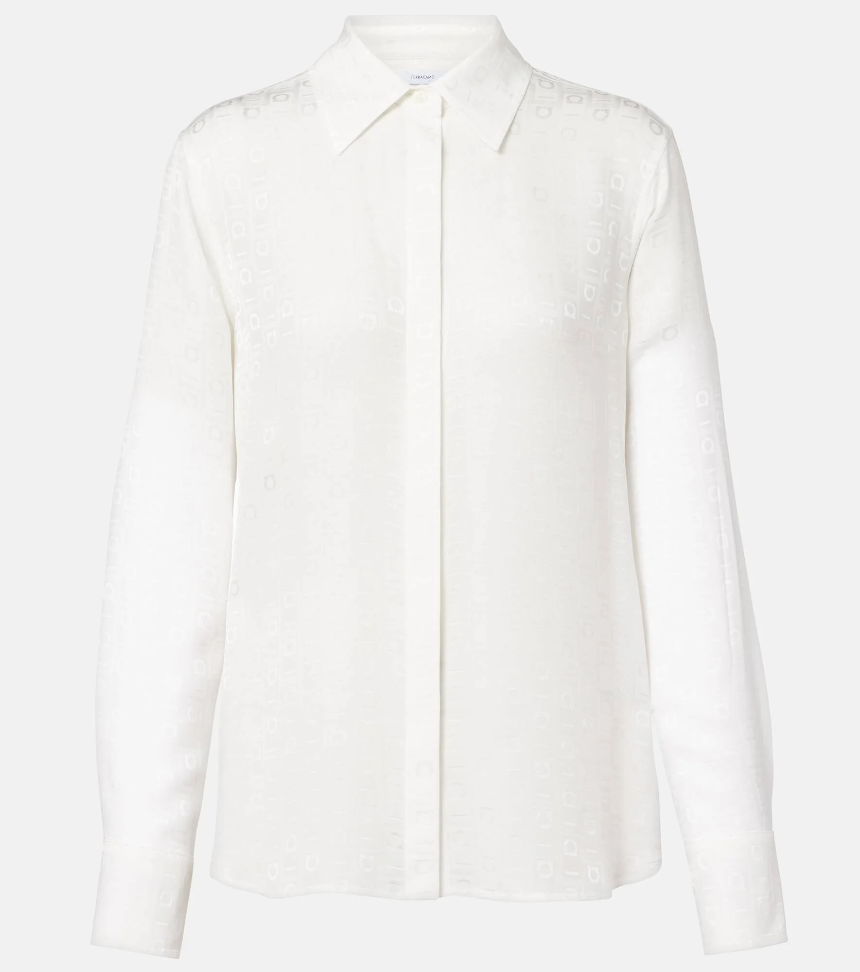 The Gancini symbol debuted 50 years ago as a fastening designed by Fiamma Ferragamo. The iconic design is featured all over this classic silk crepe shirt. Product Details - Material: 100% silk - Care instructions: dry clean - Made in Italy - Designer color name: Mascarpone - Item color: white - Contains non-textile parts of animal origin - Collar: classic (Straight point) - Closure: buttoned front - Cuff: buttoned - Item number: P01120527 Size & Fit - True to size - Straight fit - Non-stretchy fabric - Falls below the hip - The model seen in the picture is 178cm-5'10" and wearing a size IT 40