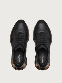 His N hers. The Brooklyn lace up sneaker oozes street style and Ferragamo class. Made of smooth calf leather, the upper is decorated with a side Gancini and suede details on the heel and the toe. The thick sole is inspired by the iconic lines of the Rainbow heel, with rounded layers in three contrasting finishes. The metallic detail creates a flicker of light with every step. Also comes in a men’s shoe for the perfect style match. - Heel 2 cm - Composition: calf leather - Made In ITALY