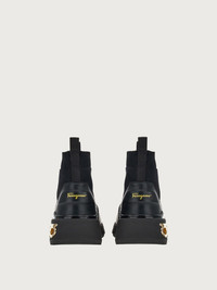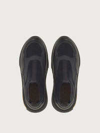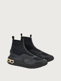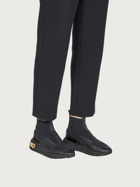 High tech, high fashion sneaker that is understated yet impactful. The sock sneaker is rewritten in a futuristic key, with nappa inserts on the technical knit for a luxurious flavor. The minimal lines in total black feature a chunky, ultra-light rubber sole, with double pull-on loops, and side Gancio for a sporty finish. - Heel 1 cm - Composition: nappa and technical fabric - Made In ITALY