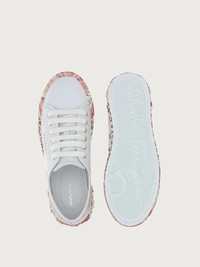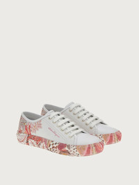 The simple, classic cut of this tennis shoe is the perfect canvas for the stunning foulard print that wraps its way around the shoe from the heel to the tip. The pattern, in shades of pink is artfully positioned and brings a truly unique flair to this off duty lace up. Ultra-light rubber sole with 3D Gancio under the heel so you can leave your mark wherever you tread. - Heel 0 cm - Composition: calf leather - Made In ITALY