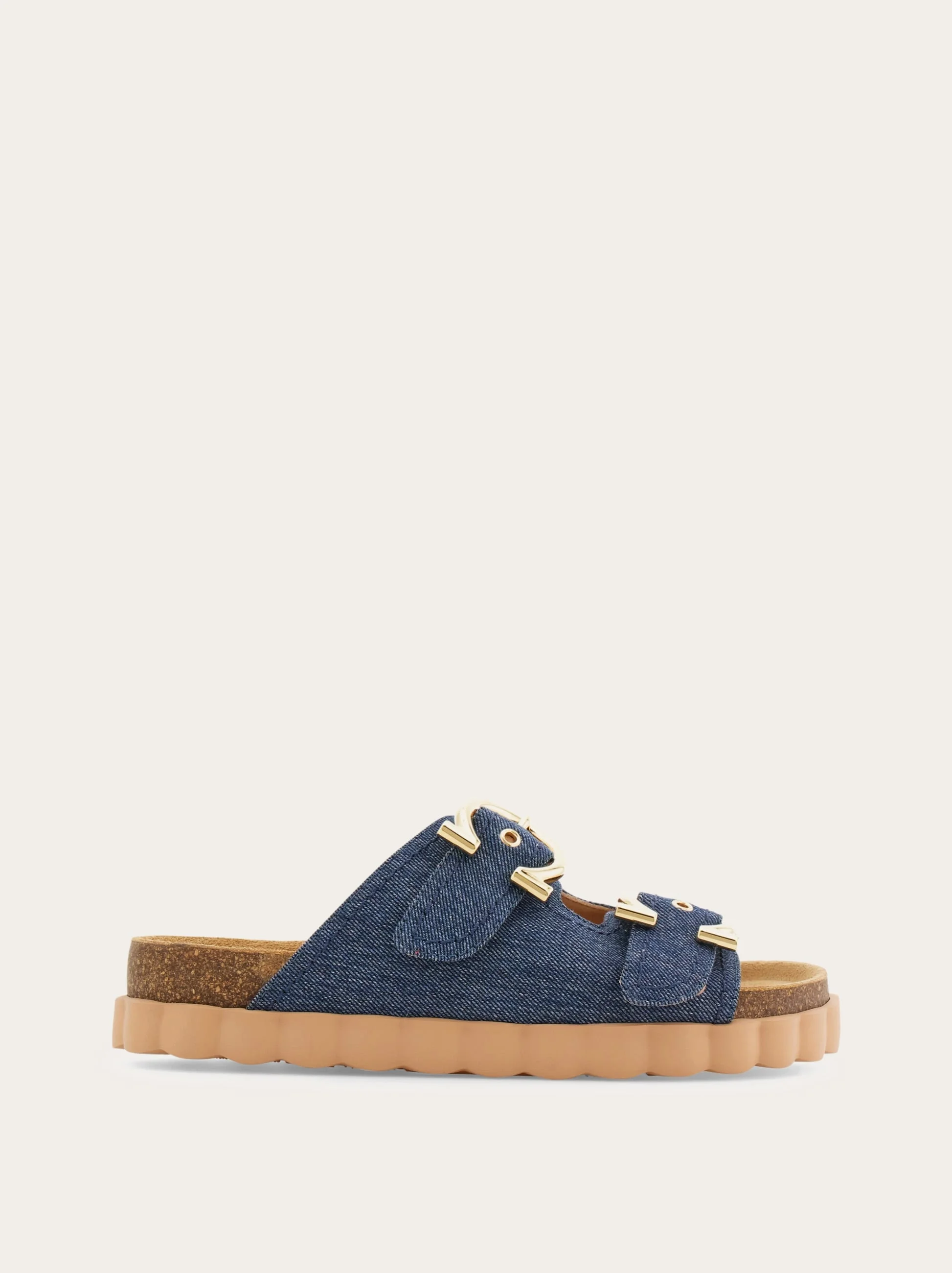 Sporty inspired sandal with a denim upper, adjustable double strap, and Gancini buckles. The anatomical suede insole complements the rubber sole with a contoured edge, inspired by the iconic flower heel. - Composition: fabric - Made in ITALY - Product code: 01L361 790715