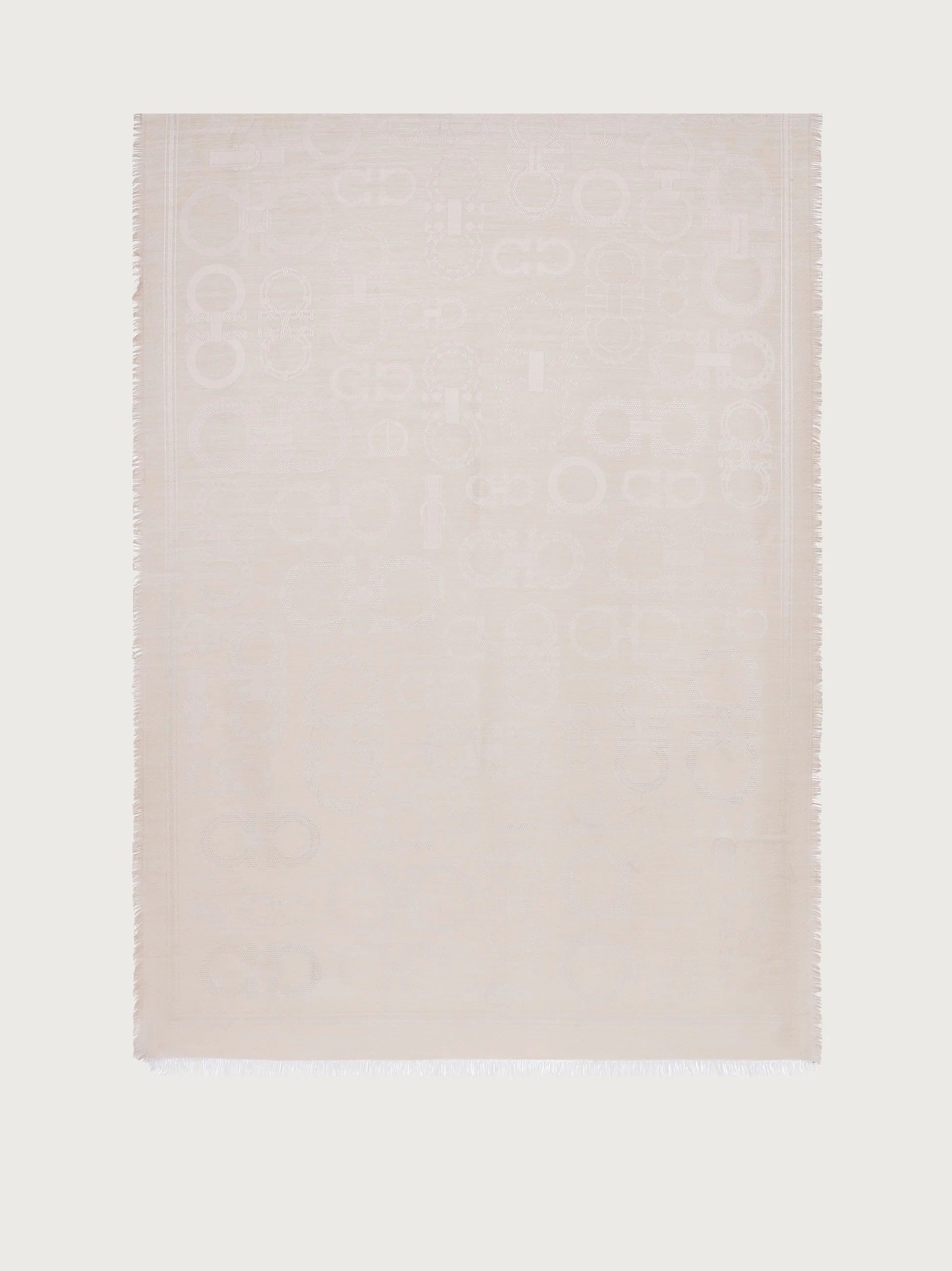 Silk and cashmere stole with a unique graphic Gancini print. The pattern is created from technical drawings of buckles and cufflinks, featured here in bright tones. Modern and sophisticated, bold and fresh. - length 78.7 IN width 27.5 IN - Composition: 60% silk, 40% cashmere - Made in ITALY - Product code: 320115 733463