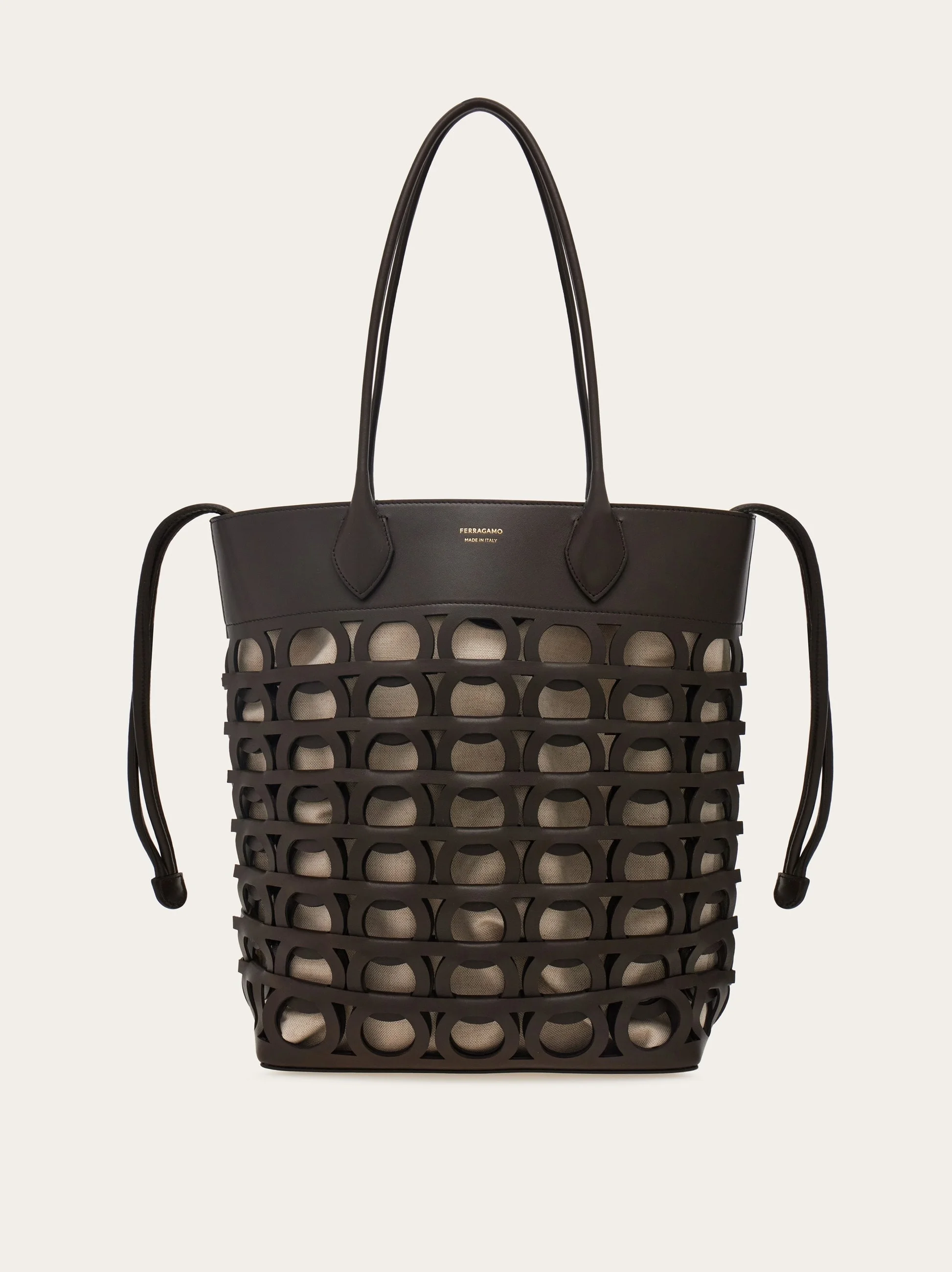 The unmistakable Gancio outline lights up the dials of this chic new top handle. Crafted using a dual layer laser technique, this masterful construction features an internal canvas pouch. Lightweight with a unique personality. - A) Height 14.5 IN B) Length 11.4 IN C) Width 4.3 IN - Composition: calfskin and fabric - Medium - Made in ITALY - Product code: 21A012 783298