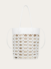 The unmistakable Gancio outline lights up the dials of this chic new top handle. Crafted using a dual layer laser technique, this masterful construction features an internal canvas pouch. Lightweight with a unique personality. - A) Height 14.5 IN B) Length 11.4 IN C) Width 4.3 IN - Composition: calfskin and fabric - Medium - Made in ITALY - Product code: 21A012 782836