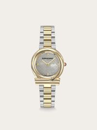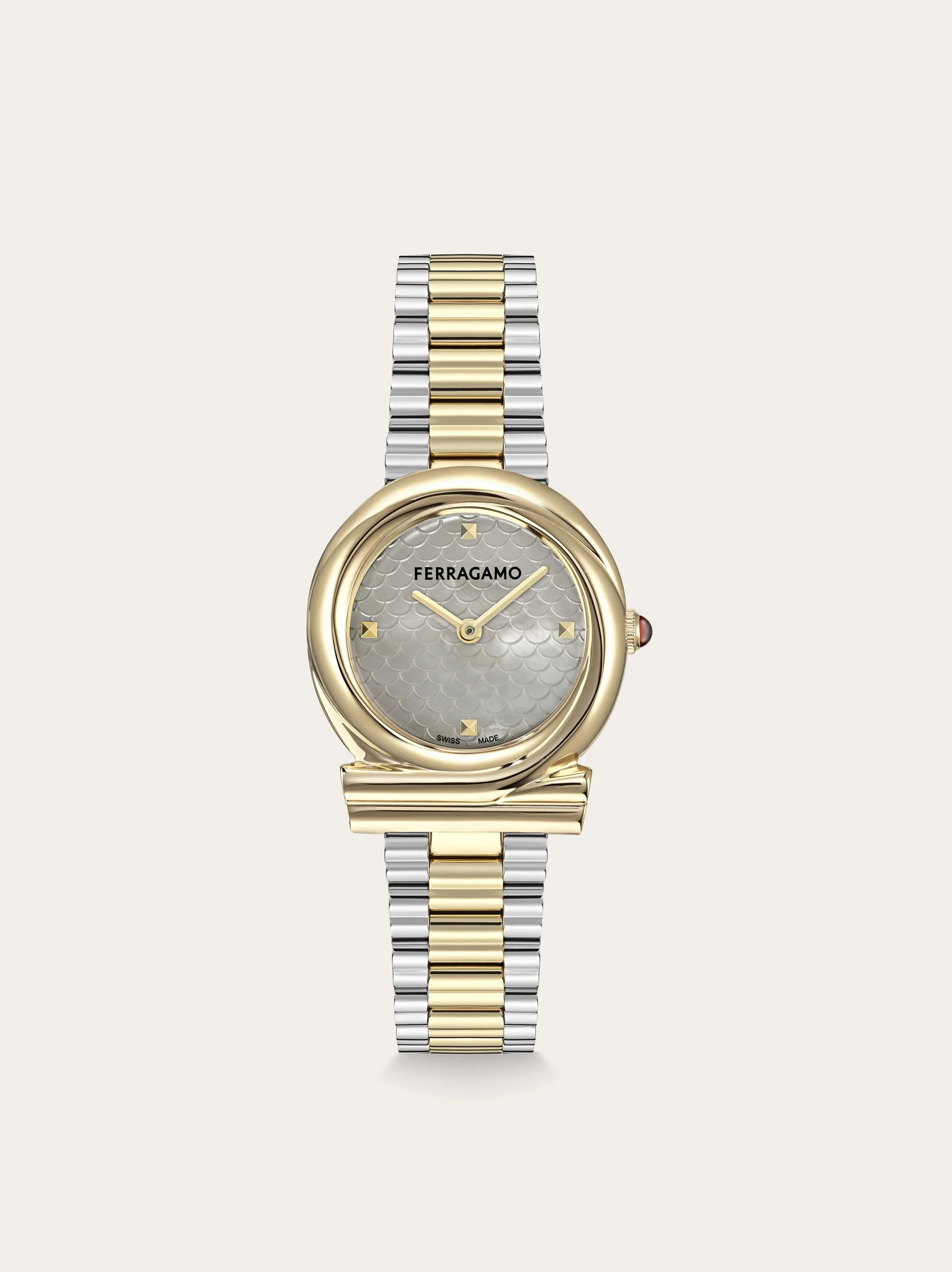 Gancini Twisted is a watch that encapsulates the essence of feminine allure and modern sophistication. The gracefully contoured case, inspired by the beloved Gancini symbol, takes on a new dimension with its intriguing twist with a 32mm case. Size: 32 mm Movement: RONDA 772 - 2 hands quartz Case: IP Yellow gold Gancini shaped Crown with red cabochon Dial: Warm grey Mother of pearl with metal studs Bracelet: Bicolor (SS&IPyG) bracelet - Butterfly buckle with Ferragamo logo Glass: Sapphire crystal, anti-reflection, scratch-resistant WaterResistance: 30meters 2+2 Year Warranty Outer box, packaging, warranty and instruction booklet - Composition: Stainless steel case and bracelet - Made in SWISS - Product code: 611335 789270