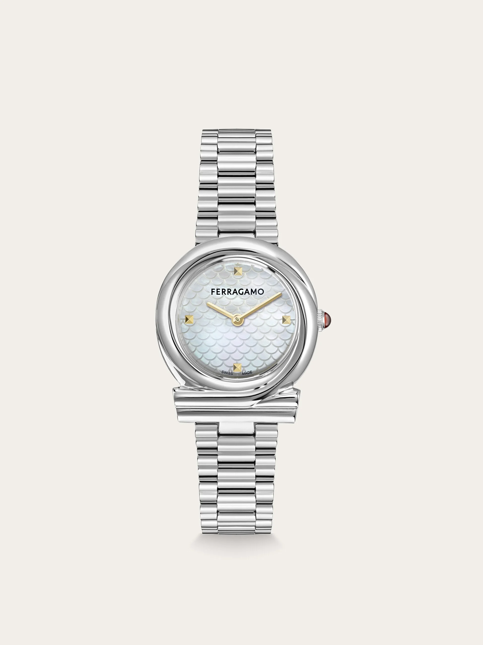 Gancini Twisted is a watch that encapsulates the essence of feminine allure and modern sophistication. The gracefully contoured case, inspired by the beloved Gancini symbol, takes on a new dimension with its intriguing twist with a 32mm case. Size: 32 mm Movement: RONDA 772 - 2 hands quartz Case: Stainless Steel Gancini shaped Crown with red cabochon Dial: Pink Mother of pearl with metal studs Bracelet: Stainless steel bracelet - Butterfly buckle with Ferragamo logo Glass: Sapphire crystal, anti-reflection, scratch-resistant WaterResistance: 30meters 2+2 Year Warranty Outer box, packaging, warranty and instruction booklet - Composition: Stainless steel case and bracelet - Made in SWISS - Product code: 611335 789269