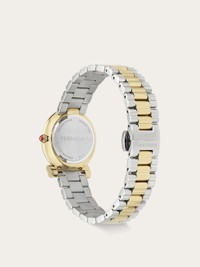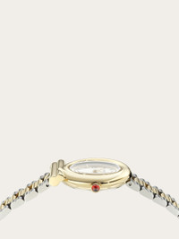 Feminine and sophisticated, the Gancini Twisted model is reimagined with a new and captivating decorative flair. The delicate lines of the case, inspired by the Gancini motif, take on a refined tactile dimension, enhanced by a torchon twist. Size: 28 mm Movement: RONDA 772 - 2 hands quartz Case: IP yellow gold Gancini shaped - Crown with red cabochon Dial: White silver sunray with printed roman numbers Bracelet: Bicolor (stainless steel & IP yellow gold) bracelet - Butterfly buckle with Ferragamo logo Glass: Sapphire crystal anti-reflection, scratch-resistant WaterResistance: 50 meters 2+2 Year Warranty Outer box, packaging, warranty and instruction booklet - Composition: Stainless steel and IP yellow gold case and bracelet - Made in SWISS - Product code: 611313 778126
