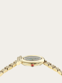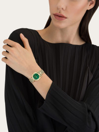 Feminine and sophisticated, the Gancini Twisted model is reimagined with a new and captivating decorative flair. The delicate lines of the case, inspired by the Gancini motif, take on a refined tactile dimension, enhanced by a torchon twist. Size: 28 mm Movement: RONDA 772 - 2 hands quartz Case: IP yellow gold Gancini shaped - Crown with red cabochon Dial: Genuine malachite stone with stud indexes Bracelet: IP yellow gold bracelet - Butterfly buckle with Ferragamo logo Glass: Sapphire crystal anti-reflection, scratch-resistant WaterResistance: 50 meters 2+2 Year Warranty Outer box, packaging, warranty and instruction booklet - Composition: IP yellow gold case and bracelet/Malachite stone - Made in SWISS - Product code: 611313 778128