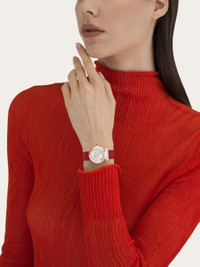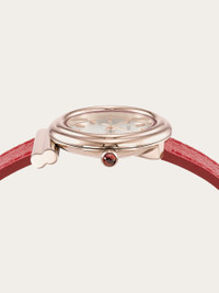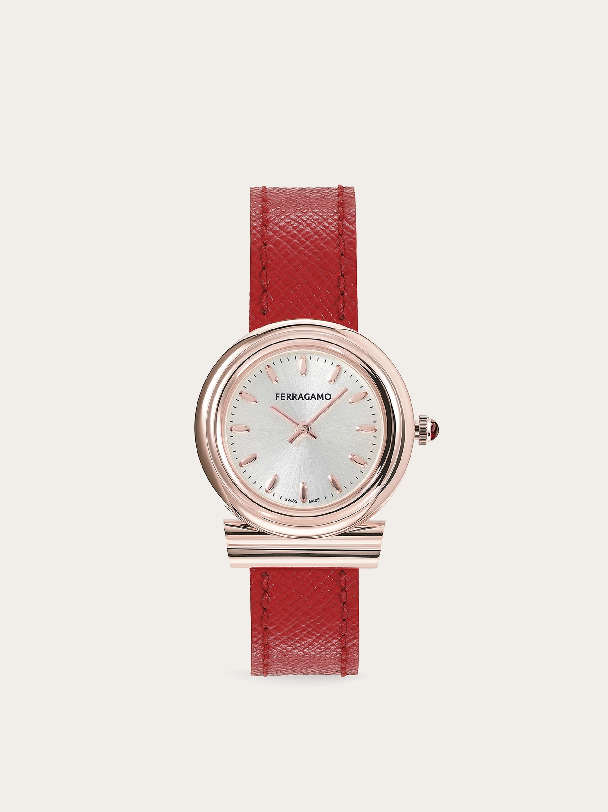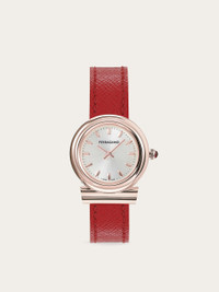 The iconic Gancini timepiece evolves with new lines and curves, featuring a 28 mm case that makes it timeless and fashionable at once. <BR> <BR>Size: 28 mm <BR>Movement: RONDA 1032 - 2 hands quartz <BR>Case: IP Rose Gold Gancini-shaped crown with red cabochon <BR>Dial: White silver sunray with applied indexes <BR>Bracelet: Red saffiano calf leather - Ardillon buckle with Ferragamo logo <BR>Glass: Sapphire crystal, anti-reflection, scratch-resistant <BR>WaterResistance: 30 meters <BR>2+2 Year Warranty <BR>Outer box, packaging, warranty and instruction booklet - Composition: Stainless steel with IP gold treatment case and calf strap - Made in SWISS - Product code: 611280 765917