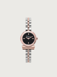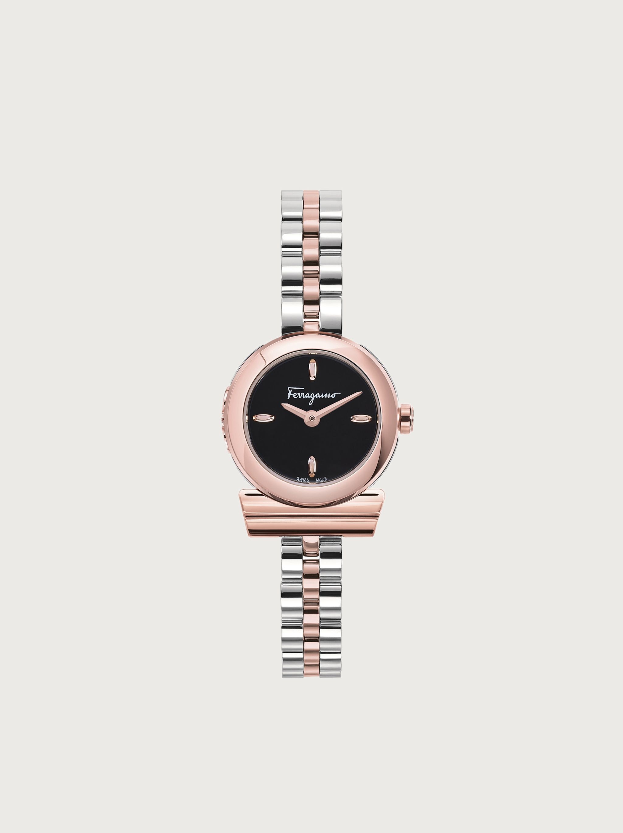 The Gancino SS23 collection brings an extremely dynamic and modern feel to the watch’s iconic case. Size: 22,5 mm Movement: RONDA 751.2 - 2 hands quartz Case: IP rose gold Gancini shaped - Crown with red enamel - Case Back: Palazzo Spini Feroni engraving Dial: Black sunray dial Bracelet: Bicolor (SS&IP rose gold) bracelet - Butterfly buckle with double Gancini logo Glass: Sapphire crystal anti-reflection, scratch-resistant WaterResistance: 30 meters 2+2 Year Warranty Outer box, packaging, warranty and instruction booklet - Composition: Stainless steel with IP gold treatment case and bracelet - Product code: 611262 760768 - Made in SWISS
