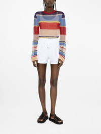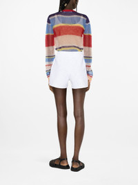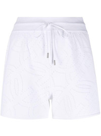 Gancio-perforated shorts from Ferragamo featuring white, drawstring waist and perforated detailing. Size & Fit Model Measurements: Height: 1.79 m Bust/Chest: 79.0 cm Hips: 89.0 cm Waist: 61.0 cm Model wears size XS Fabric and Care Designer Style ID: 759261 Designer Colour: 004 OFF WHITE Composition: Polyester 20%, Lamb skin 100%, Spandex/elastane 2%, Polyamide 5%, Viscose 73% Washing instructions: Dry Clean Only Made in Italy