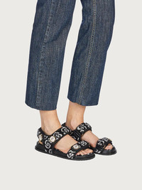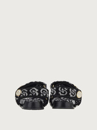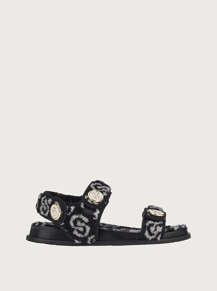 Super trendy sandal in a snuggly teddy-effect upper covered in the iconic Gancini pattern. Stand out in these winter sandals with chunky straps that wrap the foot, punctuated by fabulous golden buttons with the Gancio-S symbol. The rubber sole with personalized tread guarantees excellent grip. - Heel 1 cm - Composition: calf leather and fabric - Made In ITALY