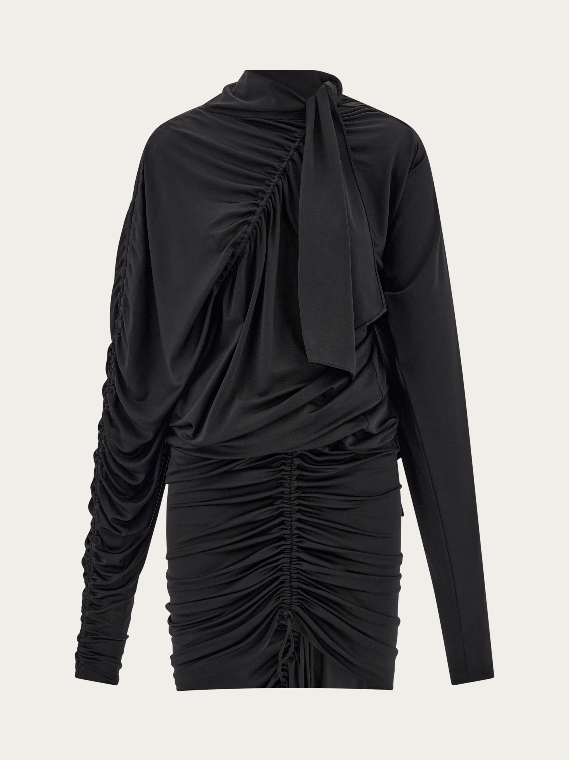 The beautifully gathered fabric enhances the voluptuous feel of this long sleeved mini dress. Stretch jersey viscose, extremely soft on the skin, is cut with a batwing sleeve and seductively gathered to hug the figure in all the right places. The scarf neckline has a button fastening, and the form fitting skirt has elastic inserts along the hips and waist, for a soft, loosened effect. - Composition: 95% viscose, 5% elastane - Model measurements: Height 5' 10"/178 cm; Bust 31½ "/80 cm; Waist 23½"/60 cm; Hips 34 "/88 cm - Model wearing: 38 - Made in ITALY - Product code: 13G396 780630
