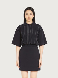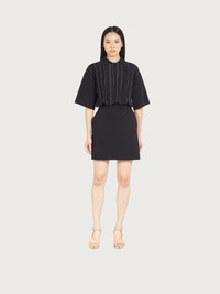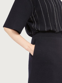 Contrasting materials with luminous touches define this pure wool knitted dress with irregular gros grain inserts. The contrasting stitching adds a twist of sophistication, while the thigh length cut confirms a contemporary feel. Raglan sleeves define the shoulder and drop to a softer fit that stops at the elbow. The drawstring waist defines the silhouette. - Composition: 100% pure virgin wool - Made In ITALY
