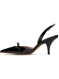 Patent leather heels. · Pointed toe · Logo charm and bow at vamp · Pin-buckle slingback strap · Leather-covered stiletto heel with rubber injection · Buffed leather lining · Leather sole · Gold-tone hardware · Heel: H2.5" Supplier color: Nero/Biscotto Leather. Made in Italy 252270F122003