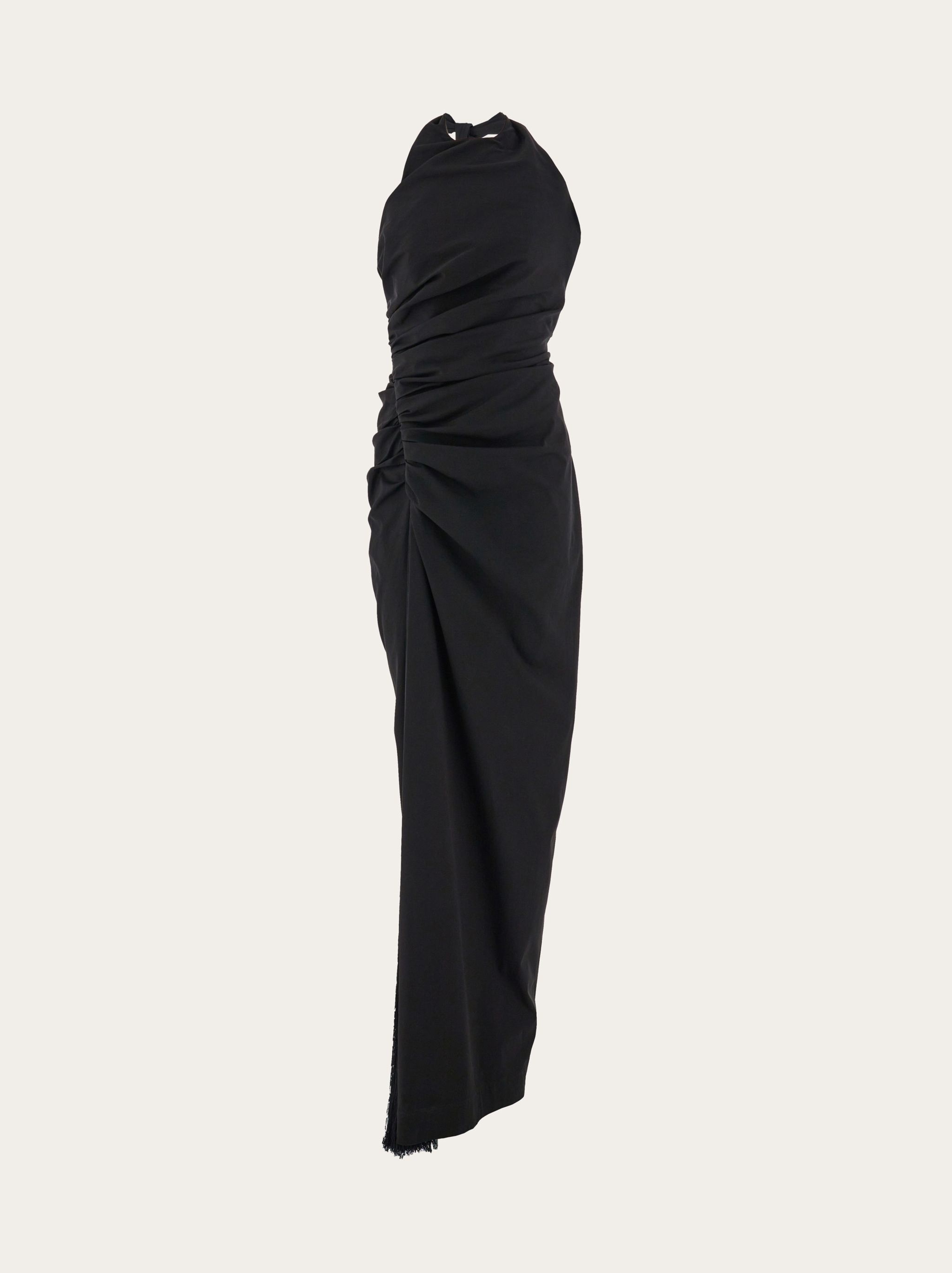 Uncompromisingly feminine, this halterneck dress is high impact and easy to wear. Made of stretch popeline the halter top ties at the neck with a large sash while the fabric is gathered at the bodice for a flattering silhouette. The large side slit up the longline skirt confirms a sensual appeal, emphasized by the sumptuous, long removable tassel that hangs from the waist. The hidden side zip ensures absolute comfort and a clean finish. Model measurements: Height 5' 10"/178 cm; Bust 31½ "/80 cm; Waist 23½"/60 cm; Hips 34 "/88 cm Model wearing: 38 - Composition: 96% cotton, 4% elastane - Product code: 13E748 772980 - Made in ITALY