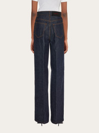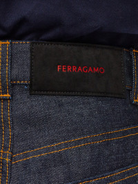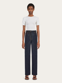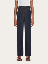 Fitted in just the right places with a super-wide leg, these Ferragamo jeans are made of pure cotton denim with a slight fade. Faithful to the classic models, the contrasting stitching defines a wide leg, high waist, and hidden zip with custom metallic button. A full crease along the leg confirms a modern look. - Composition: 100% cotton - Model measurements: Height 5' 10"/178 cm; Bust 31½ "/80 cm; Waist 23½"/60 cm; Hips 34 "/88 cm - Model wearing: 38 - Made in ITALY - Product code: 13C992 770558