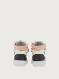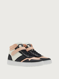 Sixties colors, space vibes and basketball inspiration. These cool, high top sneakers are a testament to the original creations of the House of Ferragamo. The soft leather upper in a savvy mix of colors, features the classic Velcro ankle strap, while the large tongue is decorated with a contrasting double Gancini, an iconic Brand symbol. Finishing touches include metallic eyelets and an ultra light rubber sole with personalized tread. - Heel 1 cm - Composition: calf leather - Made In ITALY