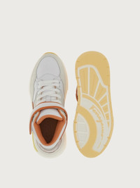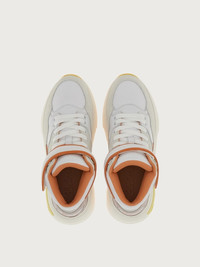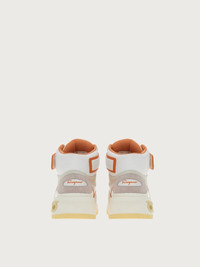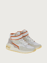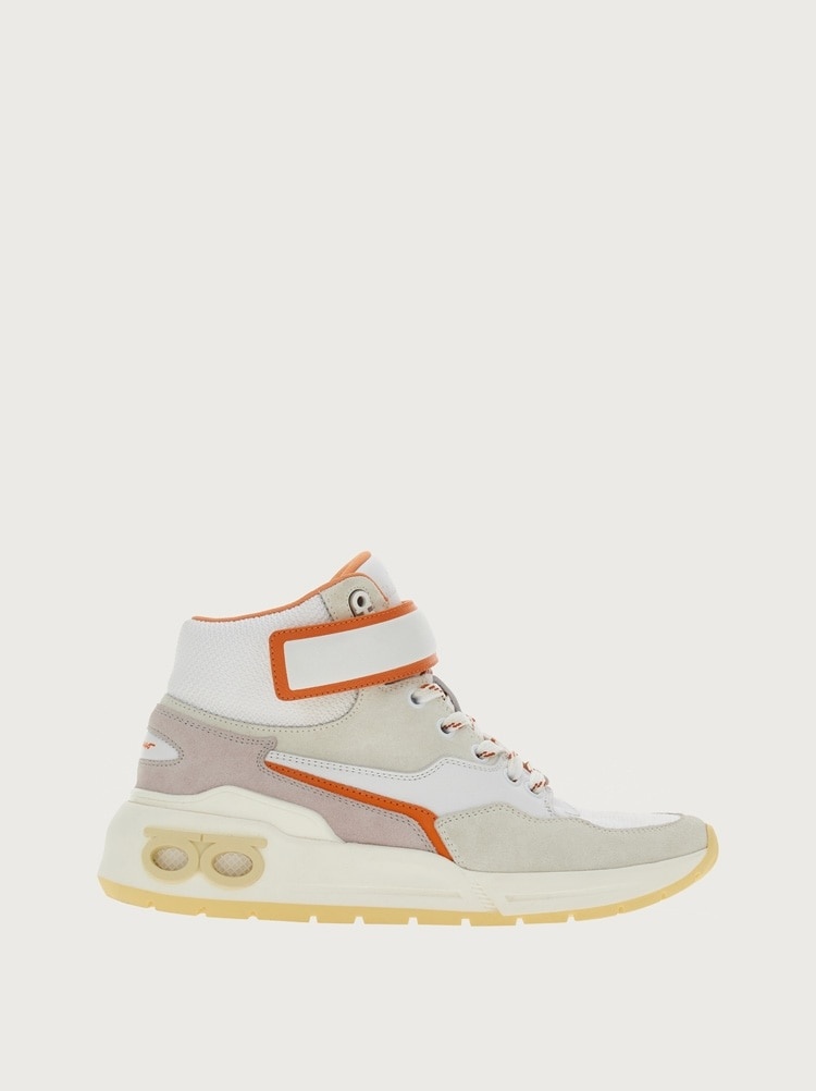 Luxurious details, Ferragamo creativity and an exclusive flavor characterize this new high top sneaker. Even the sole is something to behold, with a custom design that will turn the heads of those who walk in your wake. The upper features both leather and suede inserts, and flicks of contrasting hues. The Velcro strap at the ankle and padding at the back echo its nineties inspiration, and the Gancio eyelet its high-end status. - Heel 1 cm - Composition: calf leather and technical fabric - Made In ITALY