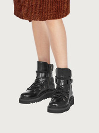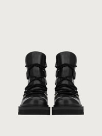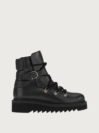 Chunky, contemporary, and frankly exciting, this winter lace up is a Ferragamo take on the hiking boot. The leather upper is punctuated by Gancio eyelets and thick, tubular laces that lead up to a belt-style strap at the ankle with Gancio buckle, and two padded inserts either side. The inside zip ensures an easy-on fit, while the chunky tread confirms a trendy appeal and offers excellent grip. - Heel 2cm - Composition: calf leather - Made In ITALY