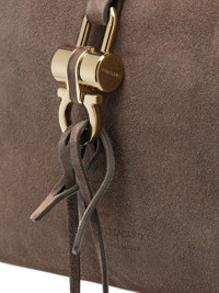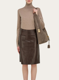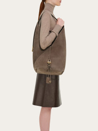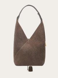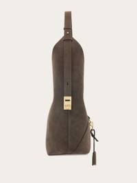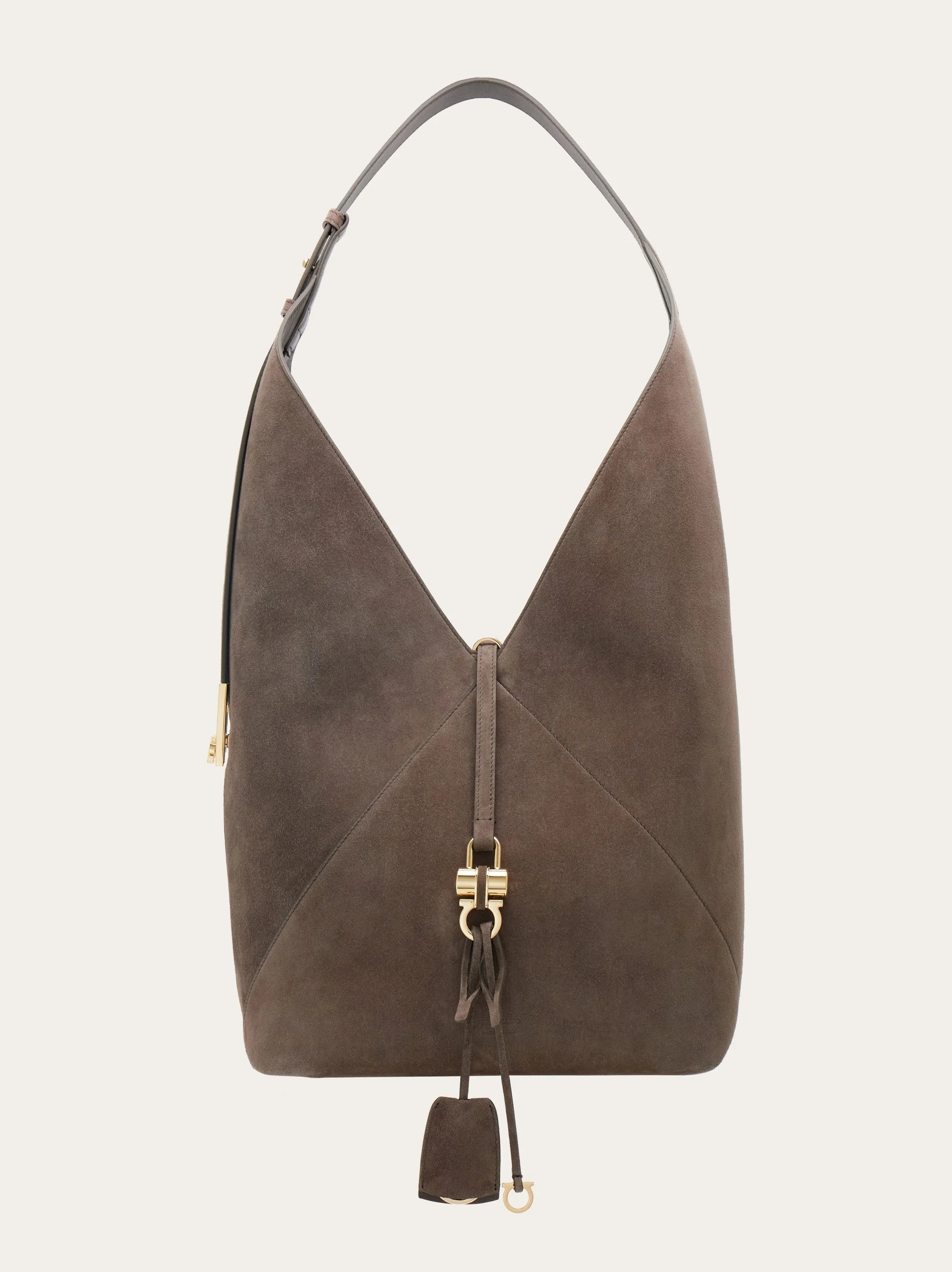 Effortlessly chic and super practical, this new Ferragamo hobo ticks all the boxes. Cut from the softest calfskin suede the stitched geometric panels offer a glimpse into its construction, meticulously detailed with Hug buckle and matching golden hardware. The mini padlock clasp on the front lends it a unique charm. - A) Height 10.6 IN B) Length 11.8 IN C) Width 6.8 IN - Composition: calfskin suede - Large - Made in ITALY - Product code: 21A004 784177