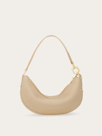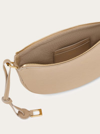 Iconic touches and a laid back attitude define this chic new Ferragamo hobo bag. Made of tumbled, hammered calfskin, the rich leather half moon silhouette has a zip opening in the center, and a linen canvas lining with two card slots inside. The leather shoulder strap has a golden Gancio buckle, and can be fastened at two different lengths; it can also be interchanged with the jacquard strap. - A) Height 5.9 IN B) Length 13.3 IN C) Width 2.1 IN - Composition: hammered calfskin - Made in ITALY - Product code: 219873 781655