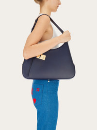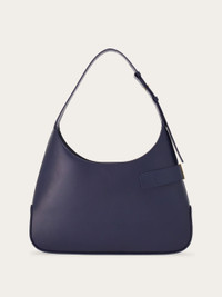 New hobo bag with metropolitan allure featuring full volume and bold details for an assertive look. Crafted from brushed calfskin, it features a rounded shape on the base and an asymmetrical pocket on the front, secured by the Gancini buckle. Lined, it is complemented by the zipped pocket and two leather slits. It fastens with a magnetic bridge fastening and is carried over the shoulder thanks to the large shoulder strap, the length of which can be adjusted. - height 23.0 CM / 9 IN length 35.0 CM / 13.7 IN width 6.0 CM / 2.3 IN - Composition: brushed calfskin - Product code: 215492 767972 - Made in ITALY