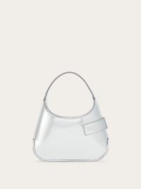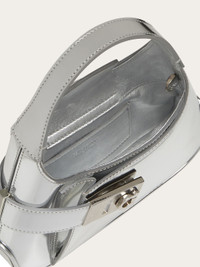 Classic lines meet contemporary cool in this chic new Ferragamo handbag. Made of mirror laminated calfskin for a high fashion feel, it has a rounded base and a geometric pocket on the front that fastens via a strap that wraps from the back with a Gancio buckle. The bridge and magnet opening reveals a lined interior with flat pocket. Carry by hand or cross body via the removable shoulder strap. - height 11.0 CM / 4.3 IN length 20.0 CM / 7.8 IN width 5.0 CM / 1.9 IN - Composition: laminated calfskin - Product code: 215943 769141 - Made in ITALY