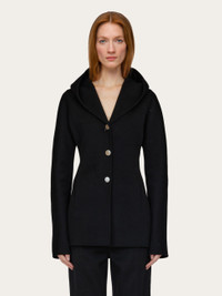 A revised iteration of the classic peacoat made of double wool and cashmere for a warm, luxurious feel. The sports-inspired hood duets with a feminine cut and single breasted button up front with rounded metallic buttons. Strategic darts on the back define the hourglass outline. - Composition: 85% pure virgin wool, 15% cashmere - Model measurements: Height 5' 10"/178 cm; Bust 31½ "/80 cm; Waist 23½"/60 cm; Hips 34 "/88 cm - Model wearing: 38 - Made in ITALY - Product code: 13F780 776524
