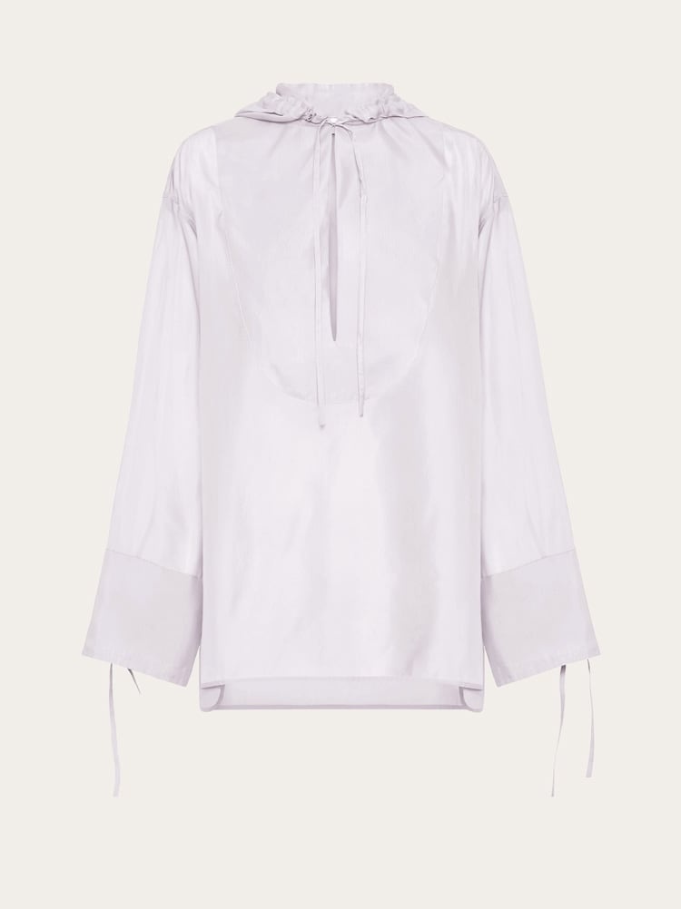 Luxury take on the hooded tunic, cut from a blend of technical silk. The fit is oversize, with a drop shoulder and ample bust. The deep slit on the collar has two laces that echo the drawstrings at the wrist. Below hip length. - Composition: 73% cotton, 27% silk - Made In ITALY